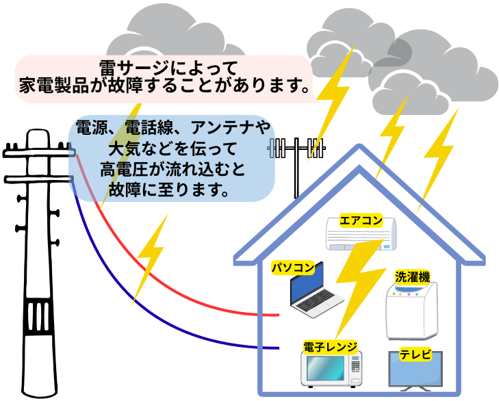 雷サージとは「雷により異常電圧が流れることで家電等の電化製品が破損すること」をいいます。